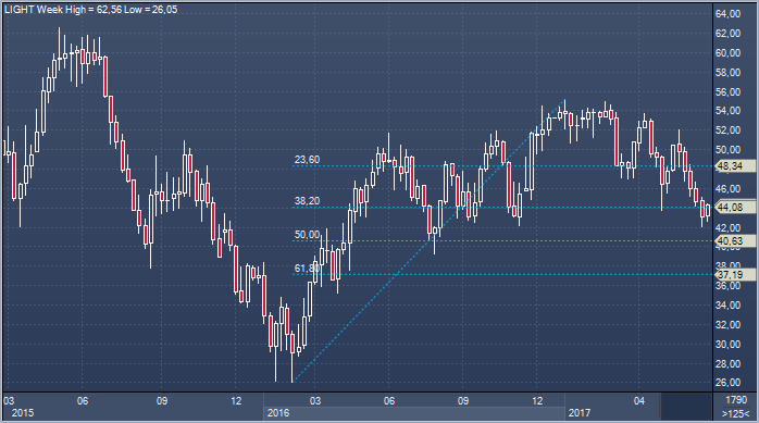 После выхода из нисходящего канала динамика нефти заметно улучшилась, однако аналитики Bank of America Merrill Lynch не видят в этом ничего удивительного. Подобное изменение в технической картине дало повод для сокращения накопившегося объема спекулятивных шортов, что в комбинации с благоприятными сезонными факторами (в банке полагают, что давление медведей ослабнет в первые две недели июля) дает повод ожидать некоторого восстановления цен. Однако для улучшения настроя на рынке причин не наблюдается, и в банке считают, что рост нефти - лишь коррекция перед падением к свежим минимумам. В Bank of America ранее озвучили опасения относительно более выраженного снижения "черного золота" и рекомендуют использовать восстановление для продажи нефти с расчетом на падение в направлении $37.20 (61.8% от роста с минимумов 2016), а возможно и ниже. В банке отмечают, что значимыми для нефти уровнями сопротивления являются $45.50 и $46.75 (50-дневная sma), при этом прорыв выше последней отметки может сгладить медвежий характер технической картины.