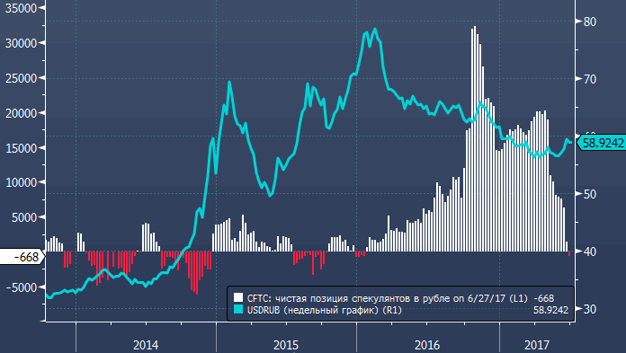 Ряд аналитиков в последнее время высказал мнение о том, что снижение рубля - это возможность для покупки, однако поведение спекулянтов говорит о том, что спешить с открытием лонгов, возможно, не стоит. Еженедельный отчет Комиссии по торговле товарными фьючерсами (CFTC) показал, что на фоне ухудшения атмосферы на рынке нефти участники валютного рынка не только решили сократить экспозицию в рубле, но и поверили в потенциал для его коррекции: впервые за последние семнадцать месяцев в рубле образовалась чистая короткая позиция - по состоянию на 27 июня она составила 668 контрактов.