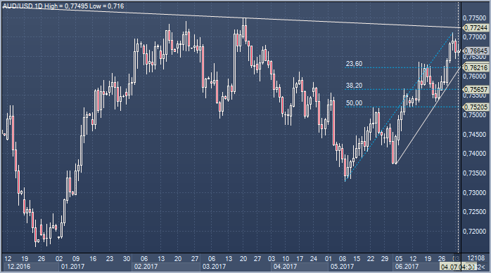 Австралийский доллар позитивно отреагировал на более сильные данные по розничным продажам, прибавив более тридцати пунктов, однако всплеск оптимизма оказался скоротечен - сегодня Резервный Банк Австралии (РБА) объявляет решение по ставке, и участники рынка проявляют осторожность. За последние недели аусси подошел вплотную к линии сопротивления с 2016 года, и дилеры отмечают, что в ожидании сигналов со стороны центробанка быки предпочитают использовать попытки роста для сокращения экспозиции. Вместе с тем, локальная техническая картина выглядит весьма конструктивной - AUDUSD остается в рамках канала и выше 23.6% от роста с минимумов мая, и прорыв выше 0.7723 обещает придать свежий импульс движению. Источник: ProFinance.Ru - Новости рынка Форекс