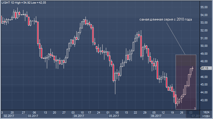 Цены на нефть могут завершить сегодняшний день ростом, сформировав 9-дневную бычью серию — наиболее продолжительню с 2010 года. В фокусе рынка еженедельные данные по запасам нефти в США, которые на этой неделе Минэнерго опубликует не в среду (как обычно), а в четверг (в связи с празднованием Дня Независимости). По итогам прошлой недели количество активных нефтяных установок на территории США, согласно данным нефтегазовой сервисной компании Baker Hughes, продемонстрировало незначительное снижение, прервав серию из 24 недель роста. При этом производство довольно заметно сократилось. Ожидания на текущую неделю предполагают аналогичную динамику, что пока поддерживает настроения быков на рынке нефти. «Мы ожидаем, что рост предложения в 3 квартале будет отставать от увеличения спроса, что позволит реализовать более масштабное сокращение запасов», - пишут в своем обзоре аналитики сырьевого рынка из UBS.