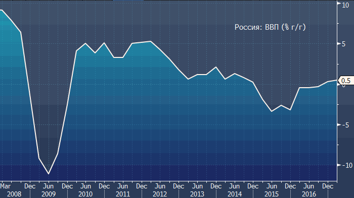 Росстат опубликовал первую оценку динамики ВВП в I квартале 2017 года по использованию. Оценка роста ВВП сохранилась на уровне 0,5% г/г. Неожиданным стал рост расходов на конечное потребление домашних хозяйств на 2,7% г/г при том, что оборот розничной торговли, по оценкам Росстата, в I квартале снизился на 1,6% г/г, а объем платных услуг населению увеличился на 0,2% г/г. Это еще раз подтверждает наше предположение о том, что Росстат в силу некоторых методологических особенностей может занижать динамику оборота розничной торговли в реальном выражении. Частично разрыв в динамике объясняется доучетом в статистике по конечному потреблению домохозяйств динамики выездного туризма и трансграничной интернет-торговли, которая не учитывается в статистике по обороту розничной торговли.