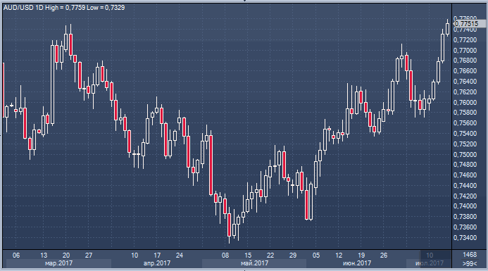Австралийский доллар продолжает расти уже пятый день подряд без очевидной причины помимо роста цен на железную руду и умеренно благоприятной макростатистики по Китаю. Резервный банк Австралии на последнем заседании воздержался от намеков на возможное повышение ставки, да и экономическая ситуация в стране не оправдывает спешную отмену стимулов. Между тем аусси/доллар (AUDUSD) вчера успешно преодолел уровень 0.7700 и сегодня замахивается на 0.7750 (максимум азиатской сессии 0.7746), при этом недельное закрытие выше упомянутого сопротивления станет хорошим поводом для движения в область 0.8000. Однако австралийский доллар уже выглядит несколько перекуплено, поэтому дальше упомянутого сопротивления дело, скорее всего, не пойдет, даже с учетом популярной нынче темы конвергенции кредитно-денежной политики, которая толкает вниз доллар США.