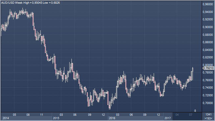 Австралийский доллар настроен на ралли и рост до 80 центов США, самого сильного уровня более чем за два года, поскольку центральный банк сказал, что экономика улучшается, по словам менеджера по денежным средствам Eaton Vance Corp. Итона Ванса, который начал выстраивать позиции на усиление аусси в мае, заявив, что доходность по облигациям страны привлекательна по сравнению с казначейскими облигациями США и Резервный банк Австралии, скорее всего, будет ужесточать, а не ослаблять политику. UniCredit SpA, самый точный предсказатель курса в последнем рейтинге Bloomberg, заявил на прошлой неделе, что инвесторы, вероятно, переоценят перспективы австралийского доллара, который, по прогнозам банка, вырастет до 80 центов в этом квартале и до 85 центов в следующем году. Австралийский доллар вырос на 1.6% до максимума с мая 2015 года, после публикации минуток июльского совещания РБА, которые отразили ожидания ускорения экономического роста во втором квартале. Доходность облигаций подскочила, поскольку центральный банк заявил, что нейтральная процентная ставка может составлять около 3.5 процента, что на два процентных пункта выше текущего рекордно низкого уровня. «Рынок экстраполирует признание RBA более прочных перспектив мировой экономики и его комментарий о том, что нейтральная ставка составляет 3.5 процента, на повышение ставки в будущем», - сказала Сью Тринь, глава стратегии Азии FX в RBC Capital Markets в Гонконге.