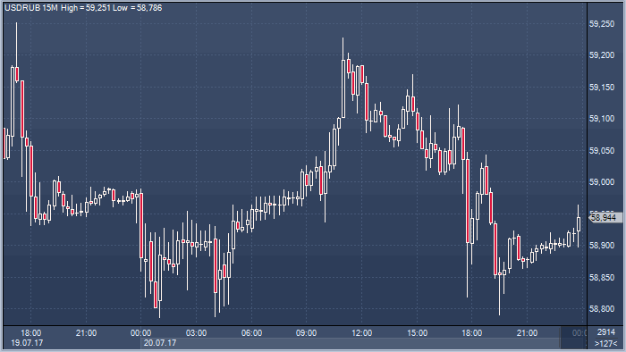 По итогам торгов в четверг 20 июля курс доллара к рублю снизился на 6 копеек и составил 58.94 за единицу американской валюты. Курс евро вырос на 63 копейки до 68.55 рубля за единицу европейской валюты (прим. ProFinance.ru: по состоянию на 23:50 мск).