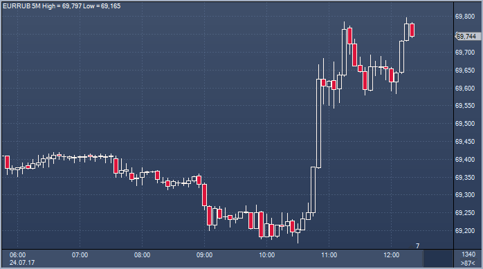 Таким образом, по официальному курсу ЦБ доллар вырос к рублю на 72 копейки, а евро вырос к рублю на 81 копейку по сравнению с официальным курсом субботы. Объем торгов на Московской бирже к 12:31 мск понедельника составил 842.6197 млрд рублей или 14 298.0481 млн долларов. Курс рубля серьезно падает сегодня, потому что завтра в США Конгресс, возможно, утвердит новые санкции против России. Налоговый период особо не помогает рублю. 25 июля пройдет уплата НДПИ, НДС и прочих налогов. Согласно разным подсчетам, объем всех июньских выплат может превысить 1.7 триллиона рублей, из них на НДПИ приходится, по разным оценкам, 280-320 миллиардов рублей.