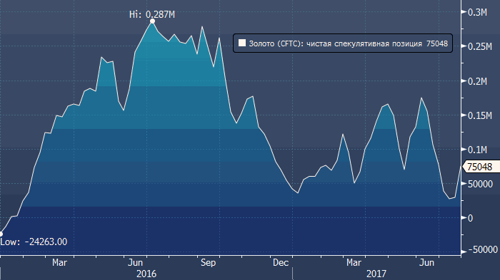 Согласно последним данным американской Комиссии по торговле товарными фьючерсами (CFTC), за неделю до 25 июля крупные спекулянты увеличили объем чистой длинной позиции во фьючерсах и опционах на золото на 46 228 контрактов до 75 048 контрактов (4-недельный максимум).