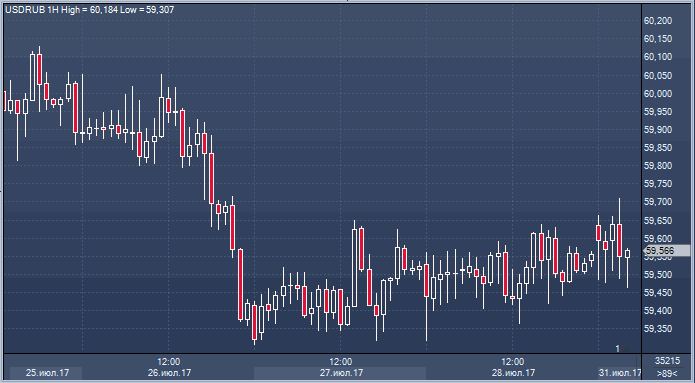 Доллар/рубль сформировал локальный минимум в области 59.30 и теперь консолидируется в узком диапазоне, демонстрируя максимум нерешительности. Решение по ставке Банка России в пятницу было предсказуемым, поэтому реакция на него вышла почти нулевая. На самом деле, даже новость о том, что Конгресс принял-таки закон о новых анти-российских санкциях не смогла расшевелить рубль. Очевидно, что эта тема уже набила оскомину и утратила потенциал движущей силы. Кроме того, рост цен на нефть компенсирует негативное влияние других факторов. За минувшую неделю баррель сорта Brent подорожал более чем на 7%. Цены относительно устойчиво восстанавливаются от минимумов в области 44.37, достигнутых 21 июня, а пятничный прорыв выше 52.00, несмотря на мутные истории вокруг соблюдения квот в странах-участницах соглашения ОПЕК+, указывает на возможность дальнейшего роста в кратко и среднесрочной перспективе. В этом контексте доллар/рубль может спуститься ниже отметки 59.00 в область линии поддержки 58.50, не покидая пределов среднесрочного диапазона.