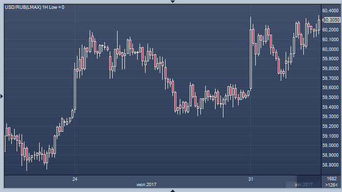 По итогам торгов в понедельник 1 августа курс доллара к рублю вырос на 53 копейки и составил 60.31 за единицу американской валюты. Курс евро к рублю прибавил 43 копейки до 71.18 рубля за единицу европейской валюты (прим. ProFinance.ru: по состоянию на 23:50 мск).