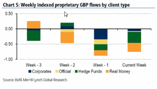 Фунт остается нелюбим многими группами инвесторов, причем реальные деньги только начали избавляться от английской валюты, согласно данным Bank of America Corp. Все типы клиентов - корпоративные счета, резервные менеджеры, хедж-фонды и институциональные счета, такие как взаимные фонды, паевые фонды, трастовые фонды - сбросили стерлинг за последние две недели, согласно анализа данных клиентских операций американского банка. «Общая позиция на рынке GBP нейтральна, но реальные деньги остаются в лонгах, предполагая риски дальнейшего снижения валюты, поскольку они продавались в последние три недели», - говорят количественные стратеги Марая Кирякоу и Афанасиос Вамвакидис. BofA рекомендует сокращать позицию по фунту, сославшись на отсутствие инвесторов, склонных открывать длинные позиции в преддверии переговоров с Европейским союзом по выходу из блока. Валюта упала до самого низкого уровня почти за восемь лет против евро на закрытии на вторник после того, как данные показали, что уровень инфляции в Великобритании в июле был неизменным на отметке в 2.6 процента, незначительно ниже оценок экономистов.