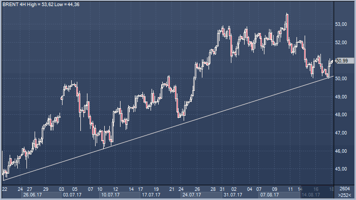 После того, как на этой неделе стало известно, что объемы производства нефти в США выросли до 2-летнего максимума, а объемы переработки китайских НПЗ замедлились до минимальных значений за 3 года, ценам на нефть трудно реализовать устойчивый рост. Хотя сейчас мы наблюдаем восходящий отскок от линии тренда, построенной с 21 июня с текущим значением в районе психологической отметки 50 долларов за баррель (сорт Brent). Аналитики Citigroup в своем недавнем обзоре уверяют клиентов, что в течение ближайших 5 лет котировкам Brent будет крайне трудно подняться выше 60 долларов за баррель.