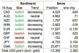 Как следует из последних данных CFTC, неделя до 15 августа прошла под знаком фиксации спекулянтами прибыли по луни, евро и киви, а также ускорения темпов ликвидации коротких позиций по иене. В результате этих событий объем чистого шорта по доллару сократился впервые с середины июня, а спекулятивное позиционирование в основных валютах выглядит так: евро, ауссии, луни, мексиканский песо и киви куплены, иена и фунт проданы, а франк нейтрален.