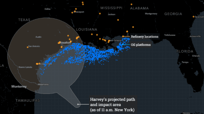 Традиционно цены на нефть повышаются в связи с ураганами в регионе. Но на этот раз инвесторы уделяют больше внимания не сбоям в поставках сырой нефти по причине эвакуации платформ и не работающих буровых установок, а сокращению производства нефти. К тому же траектория движения Харви, как видно на представленной карте, не должна захватить район с наивысшей концентрацией нефтяных установок.