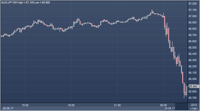 Динамика доходностей американских облигаций и общий спад оптимизма в отношении доллара не способствовали поддержанию позитивного настроя в отношении USDJPY, который в последние дни безуспешно пытался воспользоваться стабилизацией для формирования основания, и сегодняшние новости об очередном пуске ракеты со стороны КНДР стали для быков последней каплей. В то время как главный секретарь кабинета министров Японии заявил, что ракета упала в Тихий океан и, по имеющимся данным, "ничего не упало на японскую землю", представители Пентагона заявили, что ракета пролетела над территорией Японии. Такое развитие событий было крайне негативно воспринято инвесторами, опасающимися эскалации конфликта, напряжение в котором только немного ослабло в последнее время. Японская валюта на фоне спада аппетита к риску растет по всему спектру рынка, в частности доллар/иена к настоящему времени успел протестировать биды около 108.30, обозначив свежие минимумы с апреля этого года. Достаточно бурной, между тем, оказалась и реакция аусси/иены - пара спикировалаот уровней выше 87 к уровням вблизи 85.69. Источник: ProFinance.Ru - Новости рынка Форекс