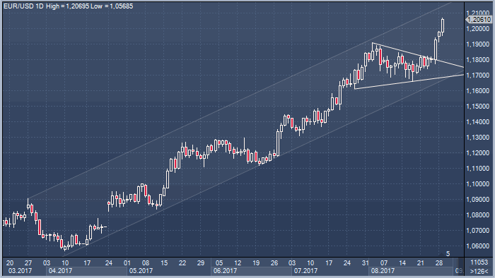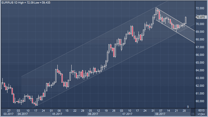 Наблюдаемое в настоящий момент резкое укрепление курса евро по отношению к доллару, также, как и стремительное ослабление рубля по отношению к единой валюте, является примером смещения рисковых настроений в стане международных инвесторов. Это совокупный результат сказанного и не сказанного в Джексон-Хоуле в прошлую пятницу, а также всплеска геополитических рисков в связи с сегодняшним сообщением о запуске Северной Кореей баллистической ракеты, пролетевшей над Японией.