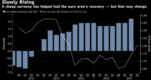 За неделю до заседания Европейского центрального банка, где будет рассматриваться вопрос о пересмотре программы стимулирования, евро угрожает вызвать приступ головной боли у экономистов. Единая валюта, которая торговалась ниже 1.04 доллара не далее как в декабре, взлетела выше 1.20 доллара сегодня, впервые с января 2015 года. Это вызывает проблемы для экспортеров региона, особенно в странах с неустойчивой тенденцией восстановления, как и для чиновников ЕЦБ, пытающихся подстегнуть еврозональную инфляцию. «Мы должны быть готовы к понижению доходов с учетом роста курса евро, и это потребует изменения в стратегии некоторых итальянских компаний», - заявил Лука Паолацци, главный экономист итальянского объединения для лоббирования бизнес-интересов Confindustria в телефонном интервью. «Ключевым здесь является влияние на экономику быстрого роста курса, как раз того, что и произошло за последние два месяца», - добавил он. Confindustria прогнозирует, что каждый 4-процентный прирост в евро против доллара сократит валовой внутренний продукт 2018 года на 0.2%.