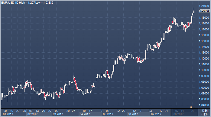 Покупки облигаций ЕЦБ в настоящее время проводятся на 60 млрд. евро (72 млрд. долларов) в месяц до декабря, и большинство экономистов прогнозируют, что они будут сокращены до нуля в следующем году. В то время как некоторые официальные лица продемонстрировали желание обсудить план на 2018 год как можно скорее, президент ЕЦБ Марио Драги только пообещал провести дискуссию «осенью». Совет управляющих, возможно, чувствует, что может справится с евро с учетом устойчивости экономического подъема. Перед тем, как валюта преодолела 1.20 доллара, президент Бундесбанка Йенс Вейдманн и руководитель Эстонского центрального банка Ардо Ханссон сказали, что укрепление евро в значительной степени отражают улучшение экономики и не вызывает особой озабоченности. Драги не упомянул об обменном курсе вообще в двух своих публичных выступлениях на прошлой неделе. «Стоит отметить, что текущий экономический подъем прежде всего обусловлен внутренним спросом, а не экспортом», - сказал Мирко Булега, управляющий хедж-фондом в Alphadyne в Лондоне. «Влияние сильной валюты на экономику может оказаться менее глубоким», - считает эксперт. Источник: ProFinance.Ru - Новости рынка Форекс