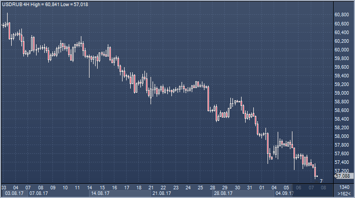 Курс рубля продолжает восхождение по знакомой тропинке к старым вершинам, покинутым в июле и августе под шум пессимистичного пения аналитиков. Рубль осрамил их и здесь, ожидавших 61-63. Доллар так и не смог закрепиться выше 60, а сегодня оказался у порога 57, откуда не так далеко и до двухлетних максимумов. Две причины движут курсом рубля по восходящей: растущая нефть и высокая отдача на капитал при размещении его в России. Нефть дорожает на фоне угроз, что новый ураган вновь выведет из строя часть производственных мощностей США и сократит предложение, пусть и на время, а также на фоне некоторого ослабления геополитической напряженности вокруг КНДР. При этом главную скрипку сегодня сыграет Марио Драги после заседания Европейского центробанка. Он должен быть готов к прямым вопросам, когда ЦБ свернет QE и как он лично и регулятор относятся к сильному росту евро в этом году (13% к доллару).