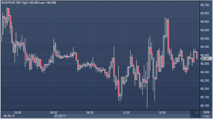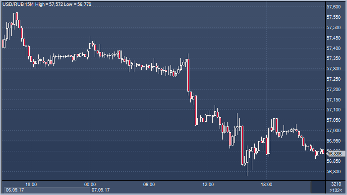 По итогам торгов в четверг 7 сентября курс доллара к рублю снизился на 47 копеек и составил 56.88 за единицу американской валюты. Курс евро символически снизился на 4 копейки до 68.38 рубля за единицу европейской валюты (прим. ProFinance.ru: по состоянию на 23:50 мск).