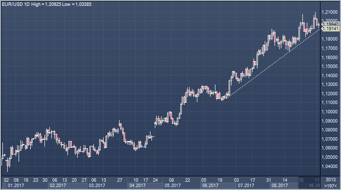Единая европейская валюта уверенно придерживается восходящего тренда последних недель, но тени на дневном графике навевают мысли о возможной паузе в восходящем движении, а значительный объем чистой длинной позиции спекулянтов (по данным CFTC на 5 сентября, во фьючерсах на CME она составляла 96309 контрактов - максимум с 2011 года) дает повод думать, что ослабление импульса может стать катализатором сокращения лонгов спекулянтами и развития коррекционной фазы. В Lloyds Bank отмечают, что даже если быки проявят упорство, сломить сопротивление в районе 1.20/1.23 им будет крайне сложно, тем более с первого раза, и в банке полагают, что попытки роста стоит использовать для фиксации прибыли. В банке считают, что баланс рисков для быков постепенно ухудшается, и советуют следить за поддержкой в районе 1.1915. Прорыв ниже откроет дорогу к 1.1810, тогда как потеря и этой точки опоры будет подтверждением смещения фокуса к 1.17/1.15. Источник: ProFinance.Ru - Новости рынка Форекс