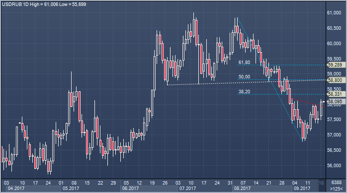 Нефть сегодня продолжили выкупать на спадах, однако попытки продолжить рост продолжили встречать отпор на подходе к $56 за баррель, и в отсутствии каких-либо иных позитивных драйверов, участники валютного рынка, резко увеличившие за последнее время объем длинных позиций в рубле, предпочли фиксировать прибыль. В итоге курс евро к рублю завершил торги в понедельник ростом на 66 копеек до 69.42, тогда как курс доллара к рублю прибавил 54 копейки до 58.07 рубля, при этом изменения в технической картине позволяют ожидать тестирования сопротивления в области 58.33/45/50 (38.2% от снижения с максимумов августа, бывшая линия поддержки, 100 и 200-дневные sma), прорыв выше которого откроет дорогу к 58.80 и 59.28.