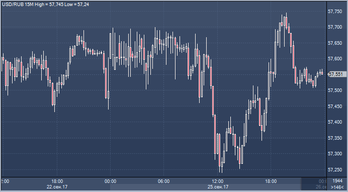 По итогам торгов в понедельник 25 сентября курс доллара к рублю увеличился на 5 копеек и составил 57.55 за единицу американской валюты. Курс евро упал на 48 копеек до 68.18 рубля за единицу европейской валюты (прим. ProFinance.ru: по состоянию на 23:50 мск).