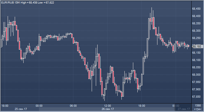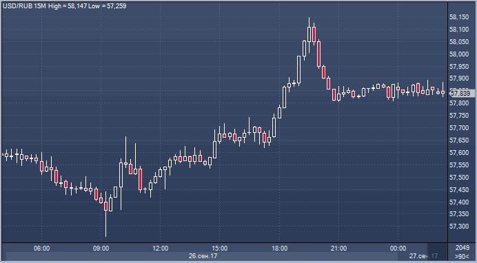 По итогам торгов во вторник 26 сентября курс доллара к рублю увеличился на 32 копейки и составил 57.83 за единицу американской валюты. Курс евро упал на 5 копеек до 68.17 рубля за единицу европейской валюты (прим. ProFinance.ru: по состоянию на 23:50 мск).