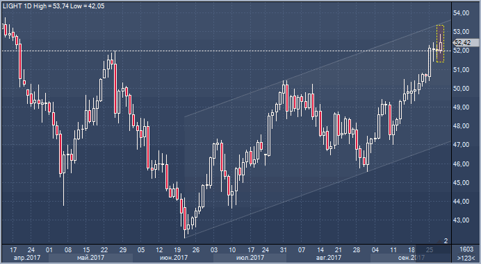 Фьючерсы на WTI на торгах в четверг достигли максимума с 17 апреля. Рост подогревается обдуманной оценкой американских статистических данных, отразивших неожиданное еженедельное сокращение запасов сырой нефти (вчера данные Минэнерго) и увеличение экспорта на 61% до 1.49 млн. баррелей в день (сегодня ежемесячный энергетический отчет), что является рекордным максимумом для данного показателя. Наблюдаемая ситуация намекает на высокий спрос на нефть на фоне полноценного возвращения к работе американских НПЗ, оправившихся после урагана Харви.