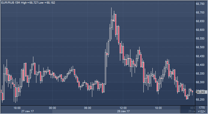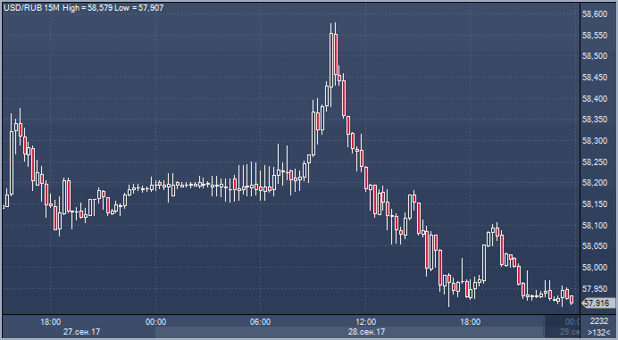 По итогам торгов в четверг 28 сентября курс доллара к рублю упал на 27 копеек и составил 57.92 за единицу американской валюты. Курс евро снизился на 13 копеек до 68.24 рубля за единицу европейской валюты (прим. ProFinance.ru: по состоянию на 23:50 мск).