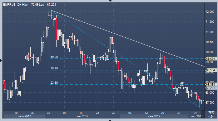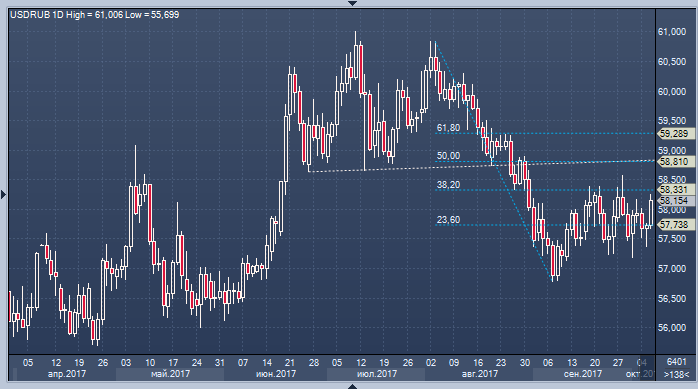 В USDRUB в центре внимания теперь вновь оказалось сопротивление в районе 58.33/60 (38.2% от снижения с августа/максимум 28/09), прорыв выше откроет дорогу к 58.80/81 (бывшая поддержка/50% от снижения с августа), после чего под прицелом окажутся уровни в районе 59.30.