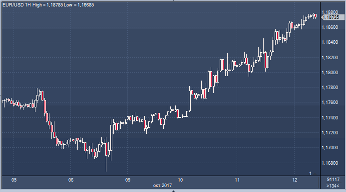 Евро идет на рекорд - пять дней роста подряд. Последний раз такая победная серия наблюдалась в начале сентября, тогда же валюта протестировала многомесячный максимум в предельной близости от 1.21. На этот раз все гораздо прозаичнее: мы всего лишь закрепились выше 1.18 и движемся по направлению к 1.19. Сегодня с утра евро/доллар добрался до отметки 1.1878 и сейчас консолидируется вблизи внутридневных максимумов. Вчера стало известно, что премьер-министр Испании Рахой дал Каталонии восемь дней, чтобы подтвердить или опровергнуть декларацию о независимости. От этого будет зависеть автономный статус региона. В общем, Пучдемон надеялся на диалог, но его не будет. Впрочем, в реальный конфликт между Мадридом и Барселоной инвесторы тоже не верят, но зато они уверены в намерении Европейского центрального банка закончить программу количественного смягчения, несмотря на то, что инфляция все еще держится ниже целевого уровня. Поэтому евро растет, подгоняемый ослаблением доллара по всему спектру рынка. Очевидно, что декабрьское повышение ставки ФРС уже полностью заложено в цены и сейчас рынок ждет вестей о том, кто станет новым председателем ЦБ, при этом более охотно реагирует на негативную статистику. В Европе ситуация несколько иная, поэтому у единой валюты хороший шанс укрепиться в ближайшие дни, особенно если публикуемые сегодня и завтра данные по инфляции в США не оправдают ожиданий.