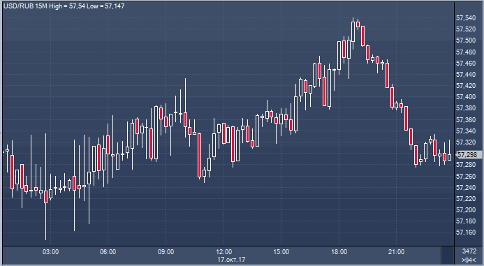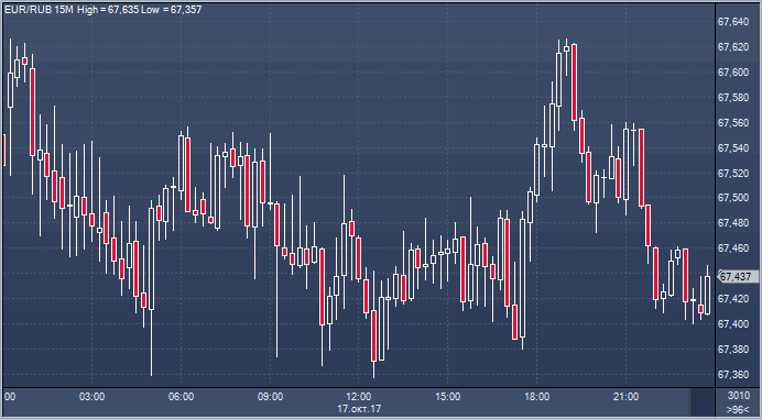 По итогам торгов во вторник 17 октября курс доллара к рублю символически снизился на 3 копейки и составил 57.30 за единицу американской валюты. Курс евро упал на 18 копеек до 67.41 рубля за единицу европейской валюты (прим. ProFinance.ru: по состоянию на 23:50 мск).