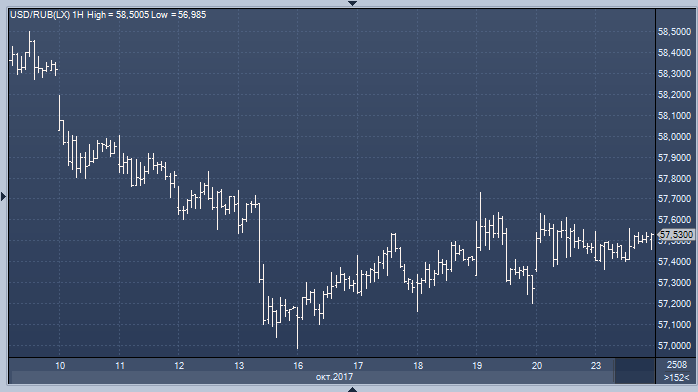 По итогам торгов в понедельник 23 октября курс доллара к рублю вырос на 5 копеек до 57.53. Курс евро к рублю снизился на 15 копеек до 67.59 (прим. ProFinance.ru: по состоянию на 23:50 мск).