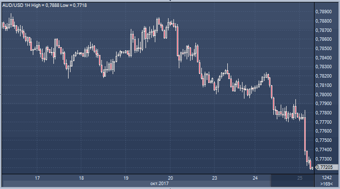 Валюта Австралии падает четвертый день подряд, при этом сегодня у нее для этого нашелся особенный повод: индекс потребительских цен (CPI) за третий квартал оказался значительно хуже ожиданий, чем сильно ослабил ожидания инвесторов относительно кредитно-денежной политики Резервного банка Австралии. Показатель снизился вместо того чтобы вырасти, и покинул целевой диапазон ЦБ, установленный на уровне 2-3%. В общем, учитывая перегретый рынок жилья в Австралии, трейдеры по-прежнему считают, что следующим шагом РБА будет повышение, а не снижение ставки. Но произойдет это, скорее всего, не ранее конца 2018 года, а то и позже. Напомним, что регулятор уже давно занял осторожную позицию, давая понять, что не намерен ничего предпринимать в ближайшее время. Похоже, что теперь рынок ему поверил.