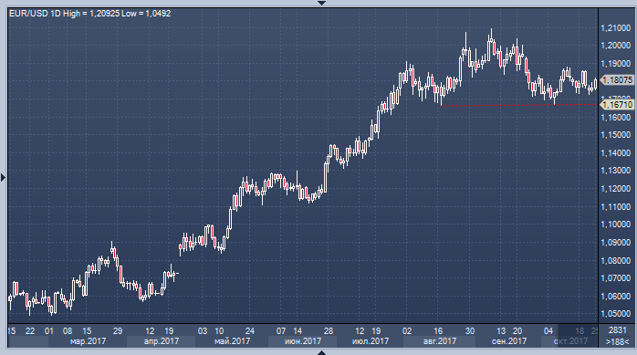 Инвесторы несколько оживились на фоне новостей относительно планов проведения налоговой реформы в США, но в целом остаются скептично настроены как относительно темпов воплощения планов в жизнь, так и конечной версии реформы, и драйвером устойчивого ралли доллара эта тема стать не смогла. Тем временем, быки по евро живут надеждой на то, что ЕЦБ, наконец, прояснит свои планы по сворачиванию стимулирующих мер, но экономическая статика из Еврозоны в последние недели не балует их позитивными сюрпризами, и в этих условиях курс евро к доллару остается зажат в достаточно узком диапазоне.