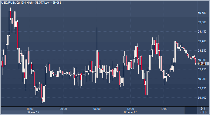 По итогам торгов в четверг 9 ноября курс доллара к рублю вырос на 5 копеек до 59.28. Курс евро к рублю - на 36 копеек до 69.02 (прим. ProFinance.ru: по состоянию на 23:50 мск).