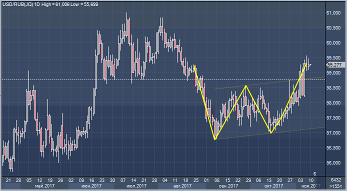Участники рынка все более пессимистично отзываются о перспективах курса рубля в горизонте до конца года. Со стороны российских компаний сохраняется высокий спрос на иностранную валюту. Традиционно в конце года выплаты по внешним займам наиболее существенны по сравнению с остальными месяцами. Компании формируют иностранную ликвидность под предстоящие платежи. Также стоит учесть и тот факт, что в ноябре (если точнее, то вплоть до 6 декабря) Минфин на рынке купит валюты на 122 млрд. рублей (5.8 млрд. в день), что значительно больше, чем в предыдущем месяце. Все больше можно услышать в стане участников рынка предположений о том, что курс доллар/рубль (USDRUB) неизбежно поднимется к 60 рублям за доллар. При этом каких-либо более высоких значений курса пока не предполагается. Да и средний консолидированный прогноз экспертов предполагает, что курс завершит текущий год в районе 59.60, то есть ниже обсуждаемой психологической отметки.