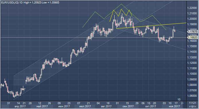 Наблюдаемая в данный момент техническая картина в паре евро/доллар, на первый взгляд, вовсе не должна пугать тех инвесторов, кто держит длинные позиции в американской валюте, либо же собирается сделать ставку на ее укрепление. Есть высокая вероятность того, что бычий тренд евро сломлен и текущие уровни привлекательны для покупок доллара под конец года. Разворотная формация, напоминающая классическую фигуру «голова и плечи» усиливает оптимизм долларовых быков.
