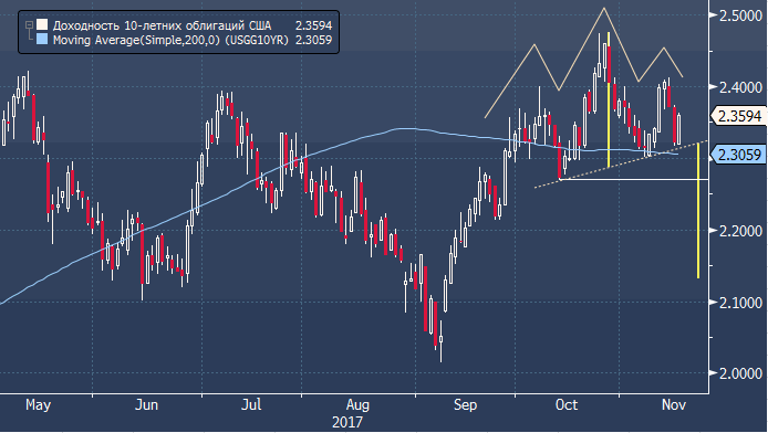 Здесь мы также видим потенциал формирование фигуры «голова и плечи». Если будет пробита линия шеи, минимум 13 октября на 2.273% и текущее значение 200-дневной скользящей средней линии (2.306), то потенциал последующего снижения доходности подразумевает под конец года снижение доходности 10-летних трежерис в область 2.15% - 2.10%. Такое ралли на рынке облигаций (прим. ProFinance.ru: доходность падает, цена облигаций растет) под конец года вовсе не подразумевает укрепление курса доллара. Наоборот, в этом случае у американской валюты явно прослеживаются очевидные проблемы.