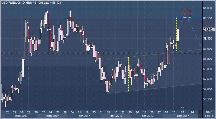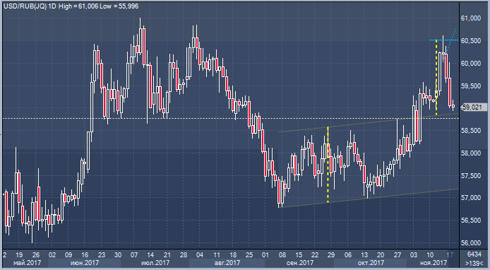 Среда оказалась переломным днем. Был сформирован максимум в районе 60.61 рубля за доллар. После этого российская валюта не менее активно начала восстанавливать потери. Тому способствовала общая слабость курса доллара на международном валютном рынке, а также стабилизация цен на нефть, которые (Brent) смогли удержаться выше 61 доллара за баррель, а затем реализовать отскок. Саудовская Аравия «подогревает» рынок, анонсируя тот факт, что соглашение об ограничении объемов производства может быть продлено по итогам заседания ОПЕК в Вене 30 ноября, хотя формально такое решение должно быть принято ближе к марту 2018 года, когда истекает согласованный в настоящий момент срок действия сделки.