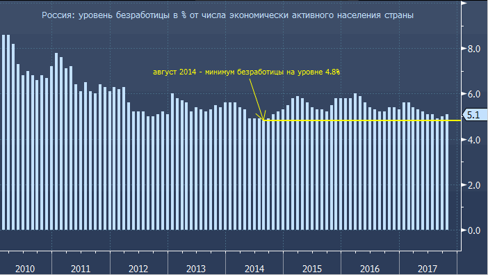 Уровень безработицы в октябре 2017 года вырос на 0.1% по сравнению с предыдущим месяцем и составил 5.1%, что соответствовало прогнозу. Таким образом, согласно данным Росстата, численность безработных в России составляет 3 млн. и 900 тыс. человек. Численность экономически активного населения в марте 2017 года составила 76.4 млн. человек. Это 52% от общей численности населения страны.