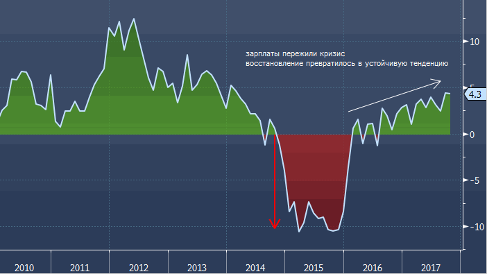 Реальная заработная плата, то есть зарплата с поправкой на инфляцию или показатель покупательной способности, в октябре 2017 года выросла на 4.3% по сравнению с октябрем 2016 года (в годовом исчислении). Прогнозировался рост на 2.9%. Показатель за сентябрь был пересмотрен в сторону увеличения с +2.6% г/г до +4.4% г/г. Банк России внимательно следит за этим показателем, пытаясь оценить инфляционную угрозу со стороны роста заработных плат.