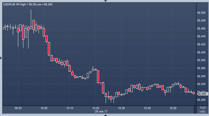 К 10:40 мск биржевые котировки пары доллар/рубль расчетами “завтра” были вблизи 58.31, и рубль набирает 6 копеек с начала дня. Котировки пары евро/рубль расчетами “завтра” находились у отметки 69.15 рубля, без изменений. Нефть марки Brent торгуется вблизи отметки $63.30 за баррель. Рубль сегодня может получить поддержку недельного аукциона по размещению ОФЗ, одного из индикаторов иностранного спроса на российские активы. Прошлая неделя принесла приятную неожиданность: после нескольких недель провальных размещений Минфин неожиданно столкнулся с многократным превышением спроса над предложением долговых бумаг. Определенное влияние на валютные котировки сегодня окажет выход в 16:30 мск предварительных данных о ВВП США за третий квартал, а также выступление действующего председателя ФРС Джанет Йеллен перед американскими законодателями, которое запланировано на 18:00 мск. Рынки не обратили внимание на то, что в ночь на среду Северная Корея впервые более чем за два месяца запустила новую межконтинентальную баллистическую ракету "Хвасон-15". "Рынок, как видно, уже привык к таким событиям. Но по-прежнему интересно, как ответят на это США", - сказал стратег Barclays в Токио Шин Кадота.