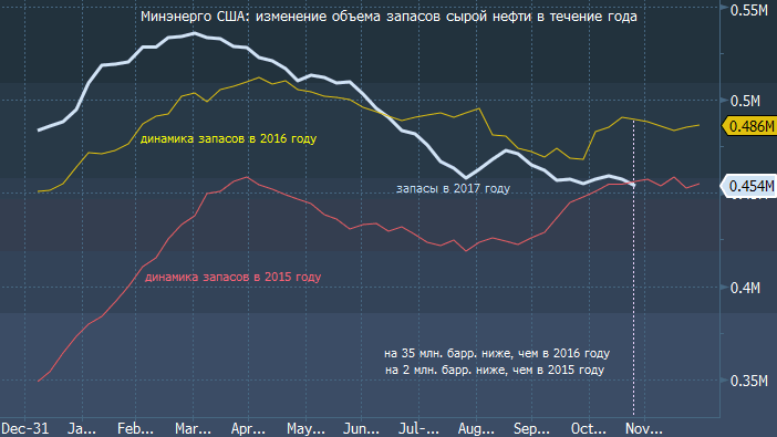 Коммерческие запасы нефти в США на неделе 18-24 ноября упали больше, чем ожидалось, однако запасы бензина и других видов сырья существенно увеличились. Это вызвало первоначально рост, а затем снижение котировок нефти на рынке. Однако основным триггером сейчас являются новости от ОПЕК. Согласно отчету Управления энергетической информации (EIA) Минэнерго США, запасы нефти снизились на 3.4 млн баррелей до 453.7 млн баррелей, оставаясь в верхней половине среднего диапазона для данного времени года. Эксперты, в среднем прогнозировали снижение запасов на 1.9 млн баррелей. Запасы нефти в терминале Кушинга (штат Оклахома), из которого производятся поставки нефти на NYMEX, снизились на 2.9 млн баррелей до 58.3 млн баррелей. Запасы бензина увеличились на 3.6 млн баррелей до 214.1 млн баррелей. Эксперты ждали, что они вырастут на 600 000 баррелей. Запасы дистиллятов поднялись на 2.7 млн баррелей до 127.8 млн баррелей, оставаясь в нижней половине среднего диапазона для данного времени года. Экономисты ждали, что они останутся без изменений. Загруженность нефтеперерабатывающих мощностей выросла на 1.3 процентного пункта до 92.6%. Аналитики ожидали, что показатель вырастет на 0.4 процентного пункта.