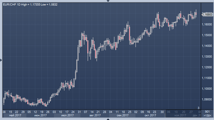 Швейцарский франк ослабел в 2017 году по сравнению с евро. Вероятно, это произойдет и в 2018, и 2019 годах, потому что швейцарская инфляция намного ниже целевого показателя ШНБ (SNB), что никак не приближает регулятора к изменению денежно-кредитной политики, при этом франк по-прежнему переоценен, говорится в обзоре ABN Amro. Банк прогнозирует, что в конце 2018 года курс франка составит: EUR/CHF 1.17 и USD/CHF 1.02. Все усилия Швейцарского национального банка по ослаблению швейцарского франка, такие как отрицательные процентные ставки и вмешательство на валютном рынке, наконец, окупились в 2017 году. Швейцарский франк потерял 8% против евро. Это было главным образом результатом общего укрепления единой европейской валюты на фоне ожиданий сокращения денежного стимулирования ЕЦБ в условиях сильного экономического роста в еврозоне и снижения политического риска в регионе. Швейцарский франк часто выигрывает в ситуациях усиления политических рисков в еврозоне, потому что он считается местной валютой безопасного убежища. Тем не менее, швейцарский франк укрепился на 4% по отношению к доллару США в этом году в основном из-за общей слабости американца.