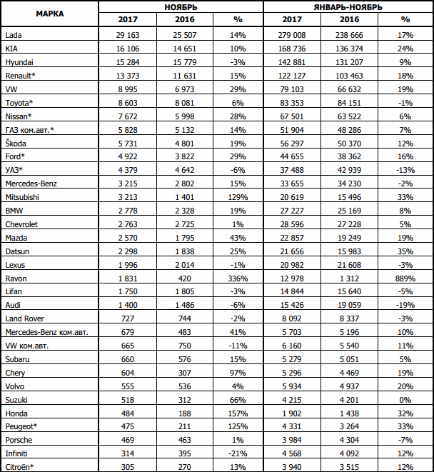 Согласно данным Ассоциации европейского бизнеса (АЕБ), в России продажи новых легковых и легких коммерческих автомобилей в ноябре 2017 года выросли к ноябрю 2016 года на 15% (19 913 единиц) и составили 152 259 штук. С начала 2017 года было продано 1 430 197 автомобилей. Кумулятивный показатель за 11 месяцев текущего года отражает рост продаж на 12%. Аналогичный показатель в прошлом году отражал снижение продаж на 12%.