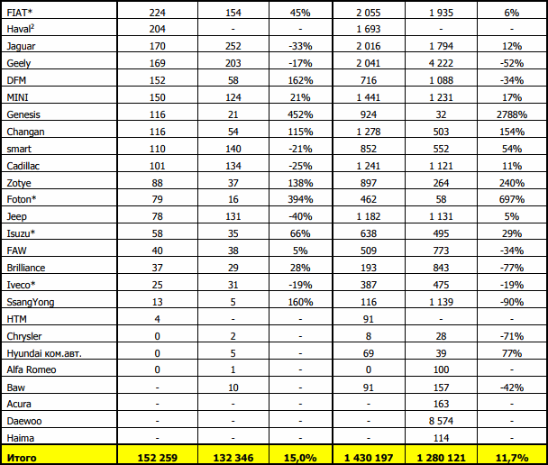 Продажи новых легковых и легких коммерческих автомобилей в России по маркам авто. Данные включают как импортированные, так и автомобили отечественной сборки. Сортировка в таблице по результатам продаж за месяц.
