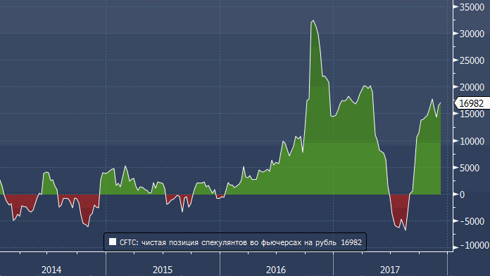 Рубль в последнее время не может похвастаться особыми достижениями, однако ситуация на рынке нефти остается в целом неплохой, а российские активы, несмотря беспокойство относительно возможности дополнительных санкций, продолжают манить своей доходностью. В этих условиях спекулянты предпочитают придерживаться лагеря быков по российской валюте, и, как показали последние данные CFTC, их чистая длинная позиция в рубле за неделю до 5 декабря выросла на 539 контракта до 16 982 контрактов. Источник: ProFinance.Ru - Новости рынка Форекс