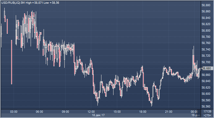 По итогам торгов в понедельник 18 декабря курс доллара к рублю упал на 14 копеек до 58.66. Курс евро к рублю - снизился на 7 копеек до 69.10 (прим. ProFinance.ru: по состоянию на 23:50 мск).