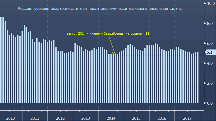 Уровень безработицы в ноябре 2017 года остался неизменным по сравнению с предыдущим месяцем и составил 5.1%, что соответствовало прогнозу. Прогноз экспертов подразумевал рост безработицы до 5.2%. Таким образом, согласно данным Росстата, численность безработных в России составляет 3 млн. и 900 тыс. человек. Численность экономически активного населения в ноябре 2017 года составила 76.4 млн. человек. Это 52% от общей численности населения страны.