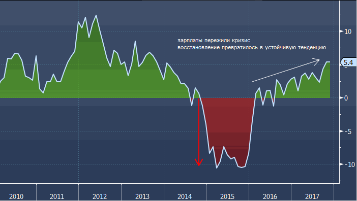 Реальная заработная плата, то есть зарплата с поправкой на инфляцию или показатель покупательной способности, в ноябре 2017 года выросла на 5.4% по сравнению с ноябрем 2016 года (в годовом исчислении). Прогнозировался рост на 4.5%. Показатель за октябрь был пересмотрен в сторону увеличения с +4.3% г/г до +5.4% г/г. .